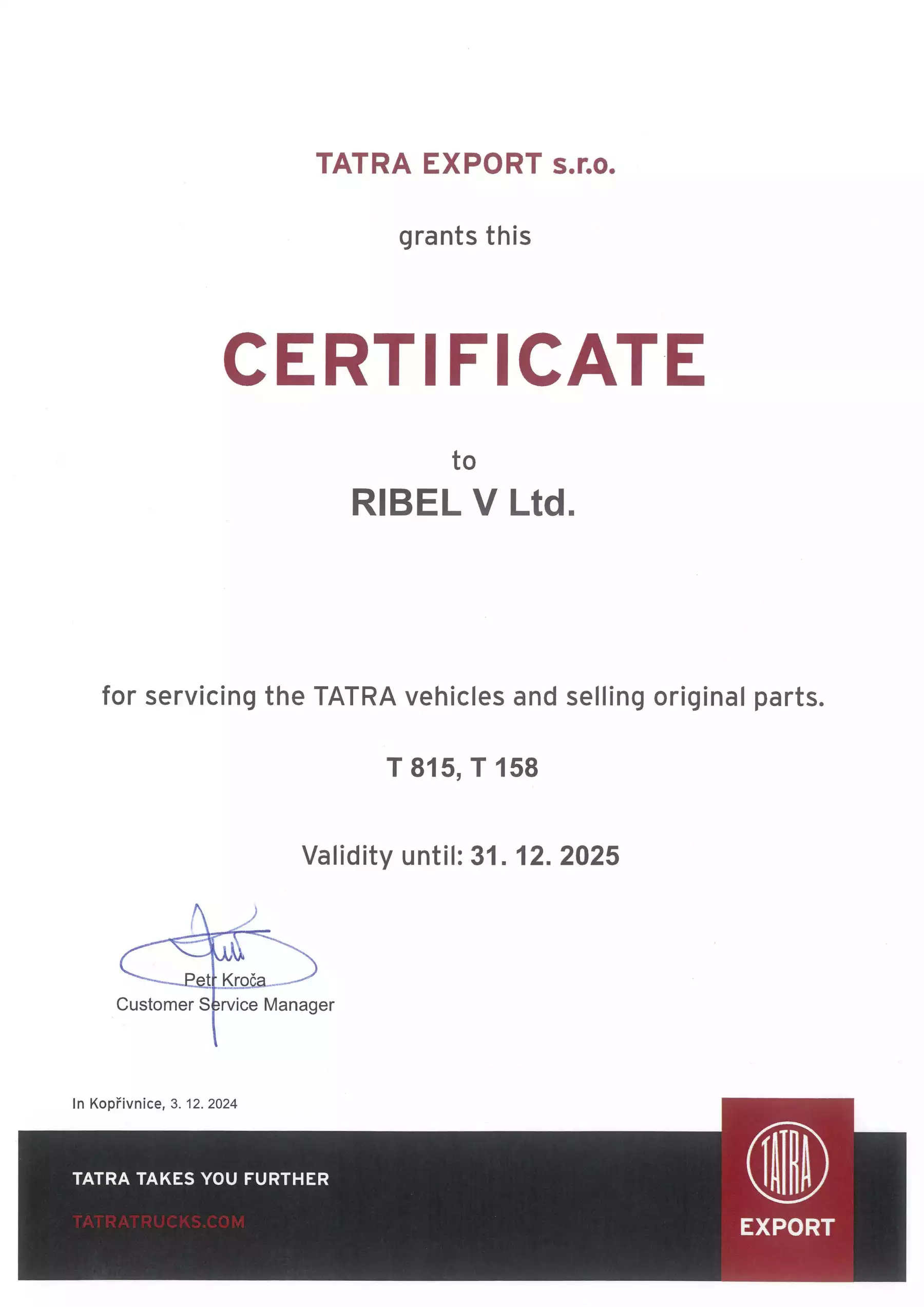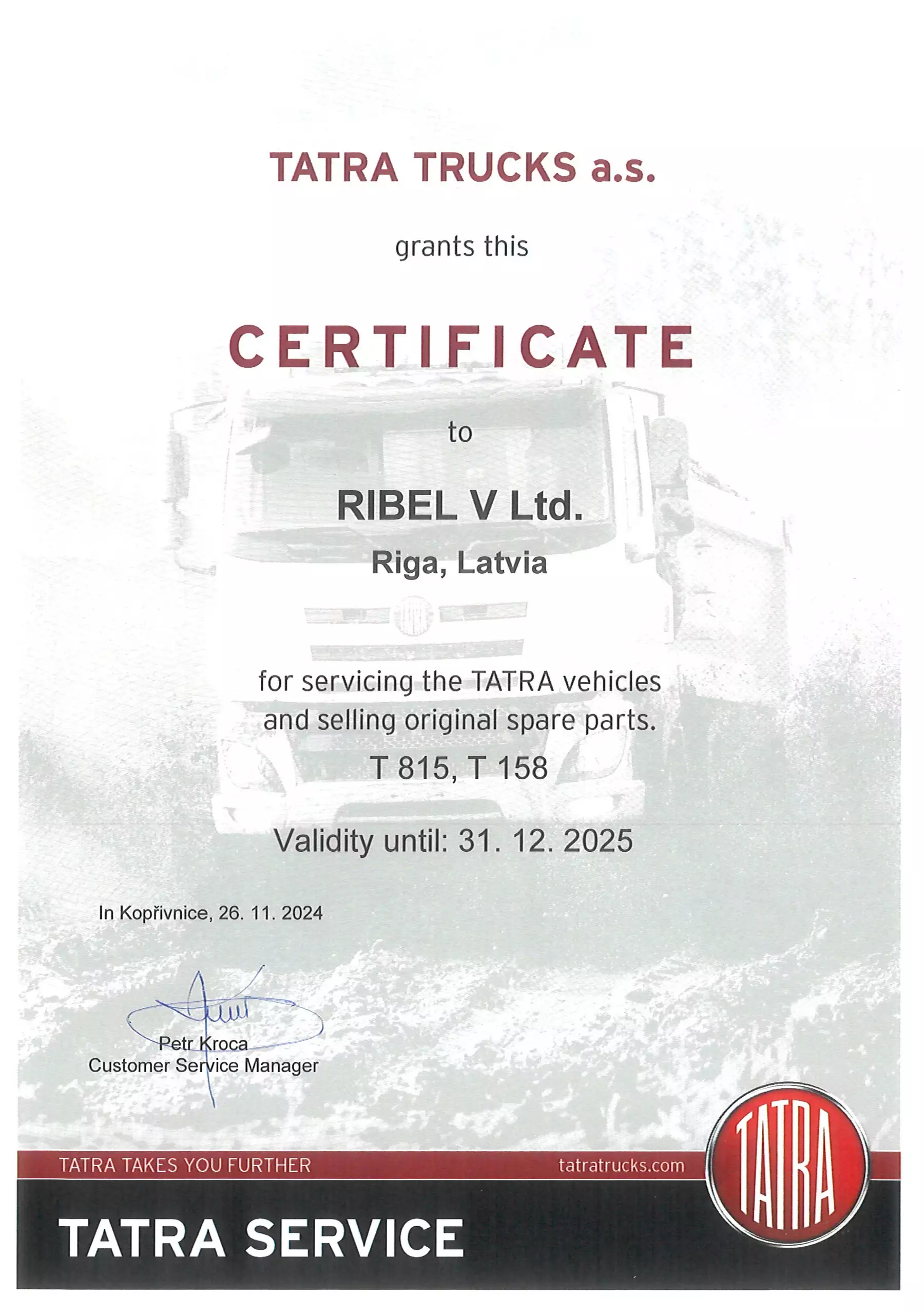 SIA “RIBEL V” ir oficiālais TATRA TRUCKS a.s. kravas automobiļu oficialais pārstāvis Latvijā un Igaunijā.